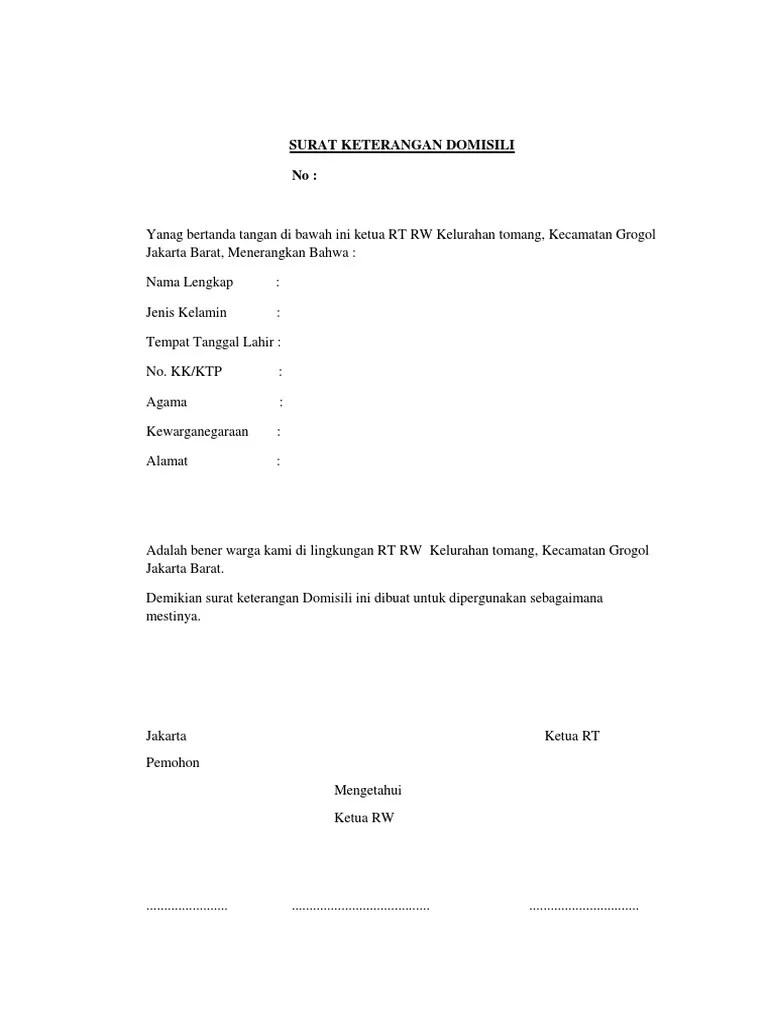 Hanya selembar surat yang isinya adalah ketua rt mengetahui ketua rw menerangkan bahwa si a dengan alamat asli di suatu tempat kini telah tinggal di wilayahnya. Surat keterangan domisili ini biasanya dikeluarkan oleh pihak kelurahan, mulai dari pejabat terendah yaitu rt hingga kepala desa. Contoh surat keterangan domisili dari rt adalah surat keterangan yang isinya menerangkan tentang tempat tinggal atau keberadaan seseorang di suatu daerah. Fotocopy ktp (kartu tanda penduduk) fotocopy kk (kartu keluarga) fotocopy buku nikah (apabila diperlukan) alamat asal lengkap. Seharusnya setiap rt rw sudah familiar dan menyiapkan blangkonya jadi jika ada warga pendatang yang datang memohon tinggal ditulis tangan tanda tangan dan stempel.